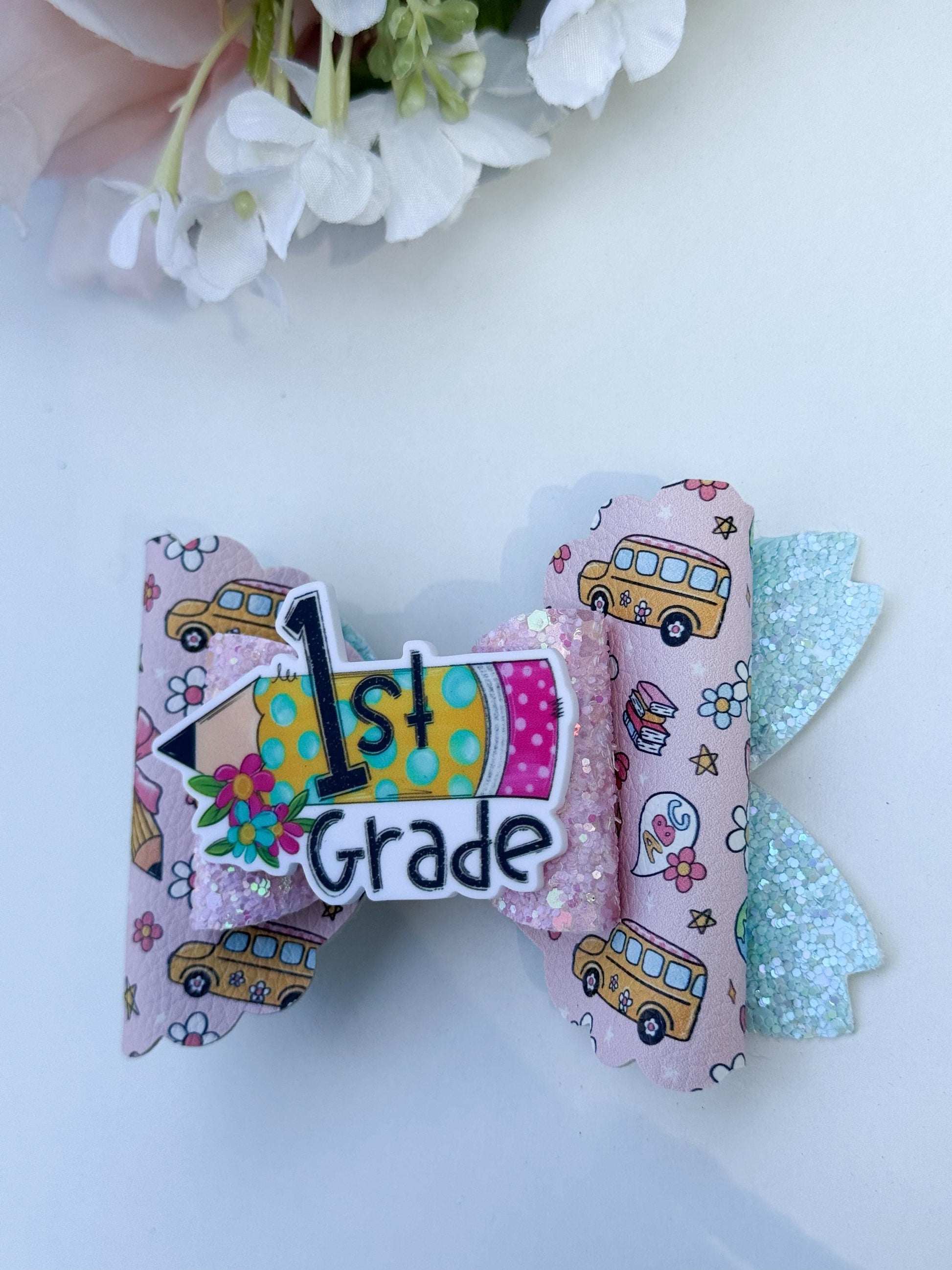 Featuring vibrant layers of pink glitter, faux leather, and adorable Hello Kitty school-themed prints, this bow is topped with a stunning shaker resin Hello Kitty dressed in glittery style-with her tiny backpack ๐