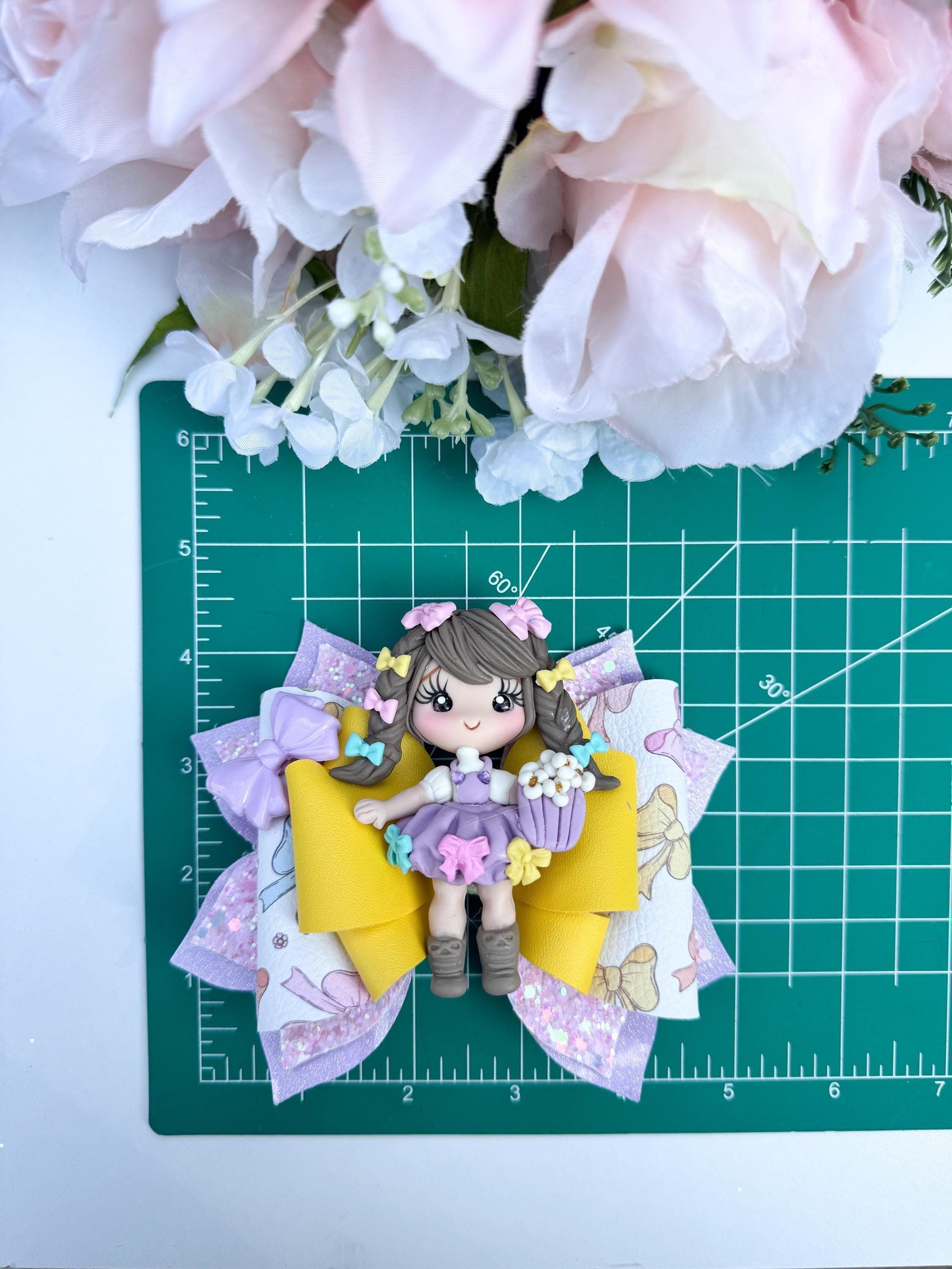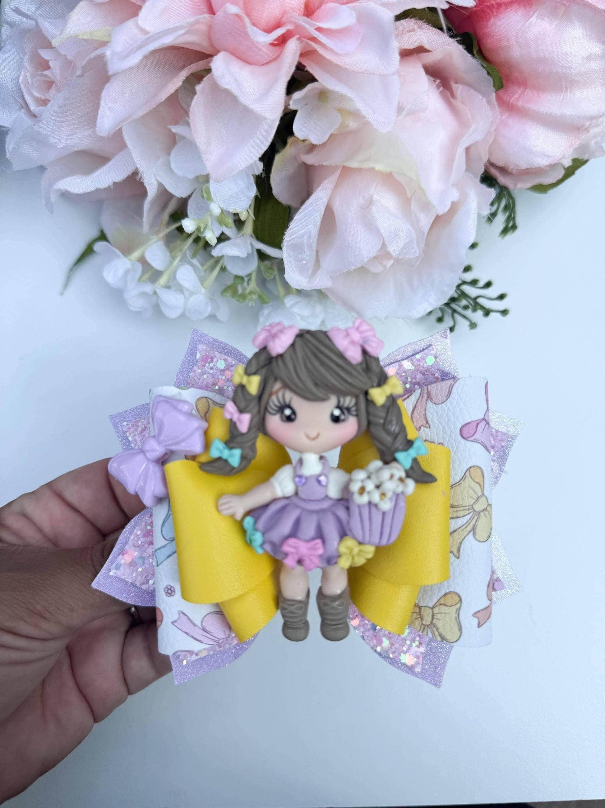 Add a dreamy, coquette touch to any outfit with this handmade bow featuring a darling clay girl adorned with sweet hair bows, a lilac dress, and a bouquet of flowers. Layered with a vibrant yellow , soft butterfly-print faux leather, and sparkling lilac glitter, this bow is the perfect blend of girly charm and elegance.